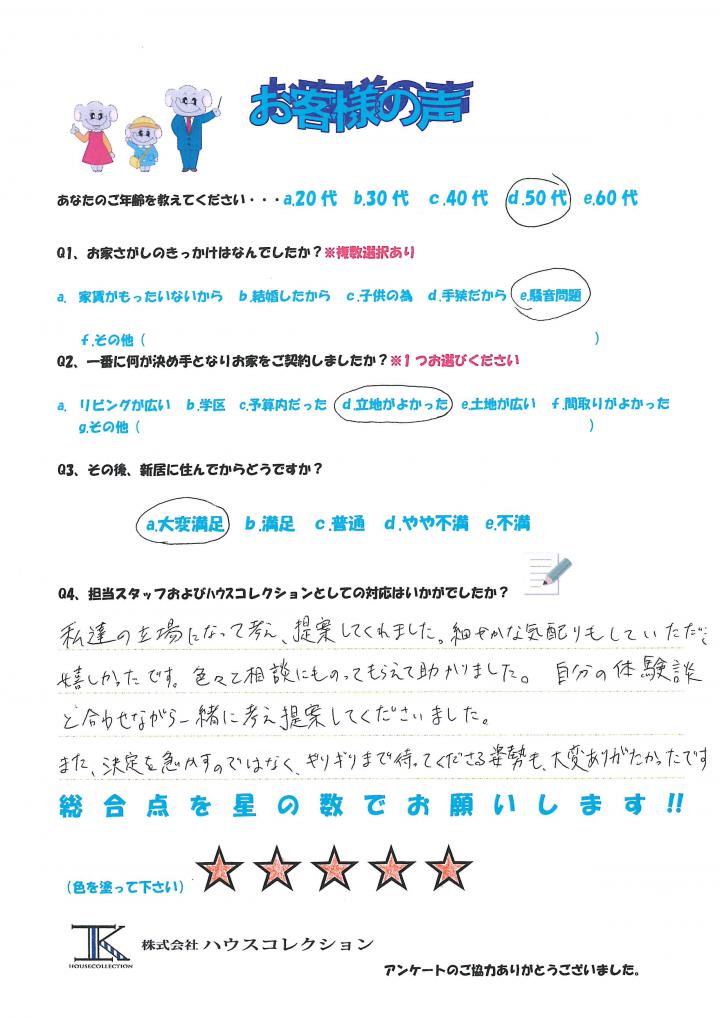 この度は新築住宅のご購入おめでとうございます(*^▽^*) また、お褒めの言葉をいただき我々もとても嬉しく思っております。 大きな買い物なのでなかなか決断できない部分と、急がないと物件が無くなってしまうというタイミングで 難しいご決断だったかと思いますが、万事うまく行って本当に良かったです☆ これからもお住まいに関してご不明な事などございましたらいつでもご相談くださいませ。 今後とも末永くお付き合い宜しくお願い致します。