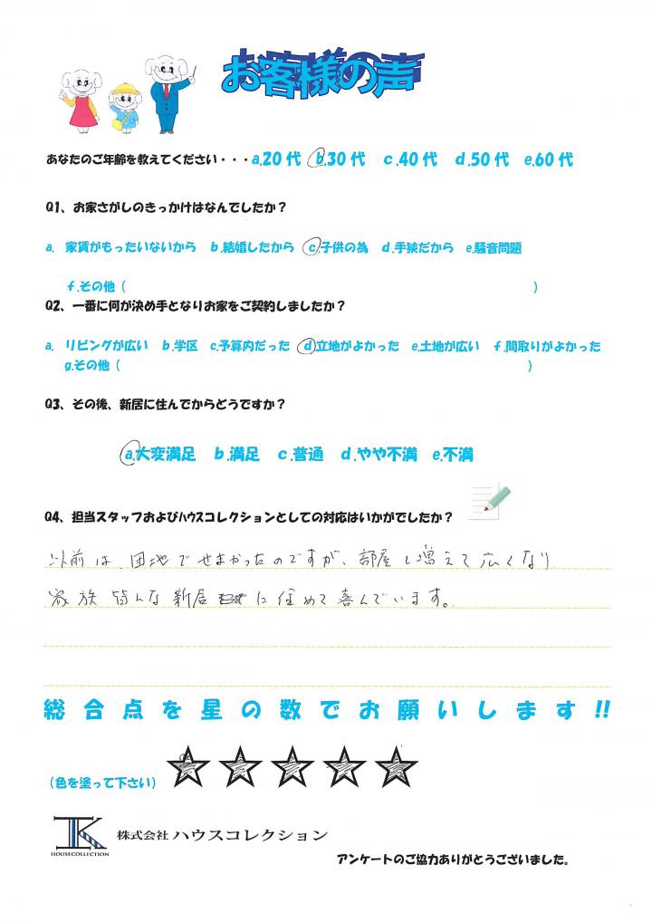 以前は団地でせまかったのですが、部屋も増えて広くなり家族みんな新居に住めて喜んでいます。