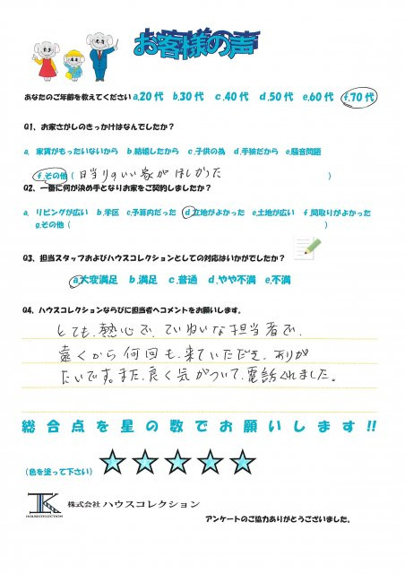 とても熱心で丁寧な担当者で、遠くから何回も来ていただき、ありがたいです。 また、よく気が付いて電話くれました。