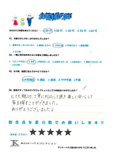 この度は新築住宅のご取得誠におめでとうございます。 お忙しい中、アンケートのご協力ありがとうございます。 N様からのお褒めの言葉大変嬉しく思います。 また、N様ご家族のご新居での生活がより一層幸せになりますよう願っております。 実際にお住まい頂いてからのご不明点など御座いましたらお気軽にご連絡ください。 これからがN様ご家族との本当のお付き合いだと思っておりますので、今後とも何卒よろしくお願い致します!!