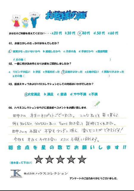 田中さん、本当にありがとうございました。 こんな私でも家を買える。 何も知らない分からない私にちゃんと向き合って説明してくれました。 田中さんのお話で不安も少しずつ消え、楽しむことができそうです! 今後も末永くお付き合い、よろしくお願い致します。