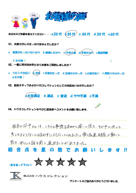 担当の田中さんは、こちらの事情を細かく聞いて頂き、その中で決して焦らせるようなことは言わずに対応してくれました。 常に私達目線で動いて頂き、安心して話を前に進めることができました。